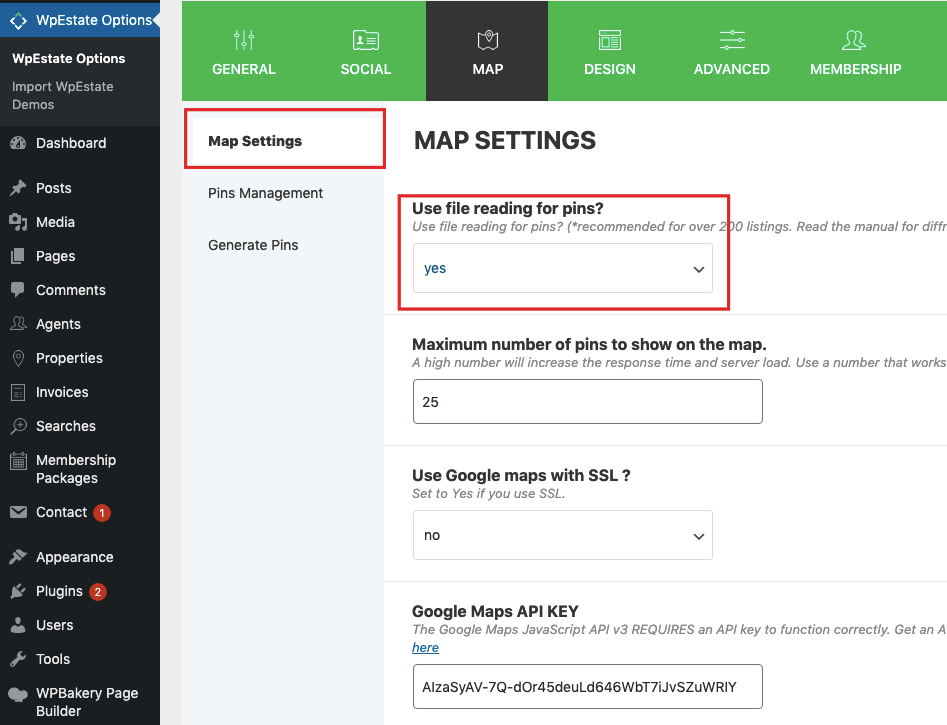 If Read from Map is enabled – and you have a page with a header as google page (and this page is a default page), you see all properties pins. That’s how read from file works and applies only for pages with a default template and header media set to google maps.