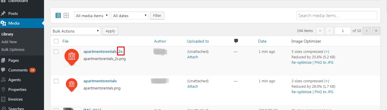 3. Go to Media – add new and upload the retina pin version. It is important that both files (retina and non retina) are in the same Uploads folder (same year / month folder) as non retina version.